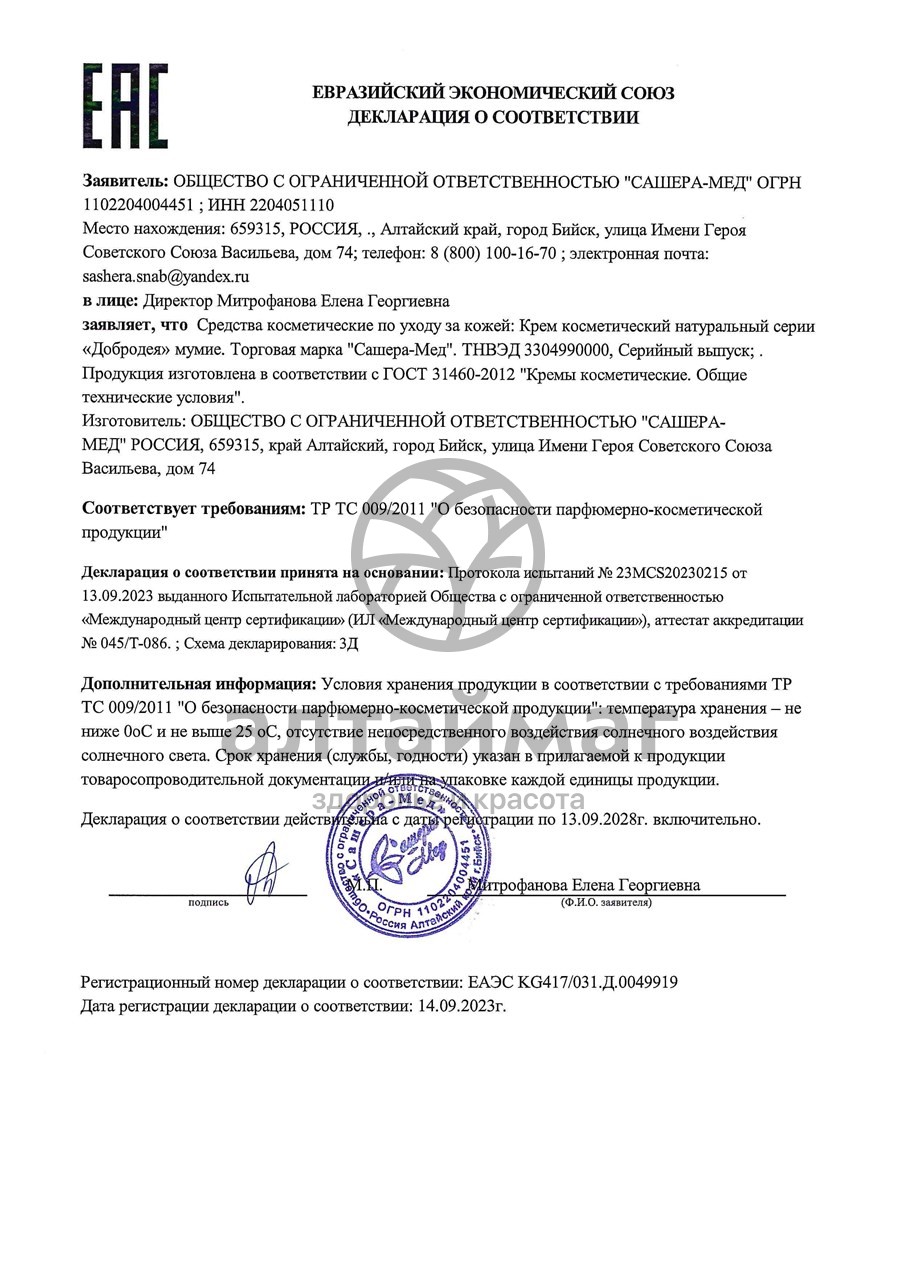 Крем косметический «Мумиё» серии «Добродея» - натуральный крем на основе мумиё алтайского, живицы кедра, меда, каменного масла, подмора пчелиного, экстракта лопуха, Д-пантенола. Крем не содержит синтетических компонентов, эмульгаторов, консервантов.