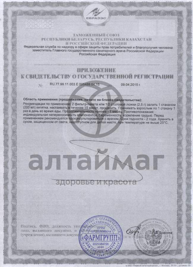 2 фильтр-пакета (3 г) залить 1 стаканом (200 мл) кипятка, настаивать в течение 15 минут, процедить. Принимать взрослым по 1 стакану 1 раз в день во время еды.