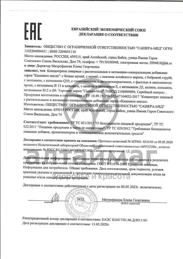 Каменное масло торговой марки «Сашера-Мед» собирается в Горном Алтае не менее чем 2 тыс м над уровнем моря при использовании специального аналитического оборудования, исключающим попадание посторонних минералов.