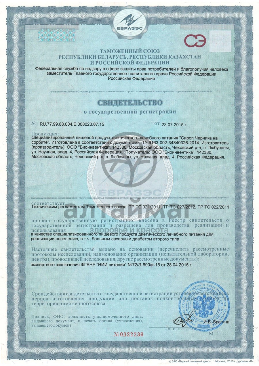 - «Сироп черники на сорбите» прошел Государственную регистрацию и клинические испытания в Научно-Исследовательском Институте питания РАМН и рекомендован больным сахарным диабетом 2 типа.
