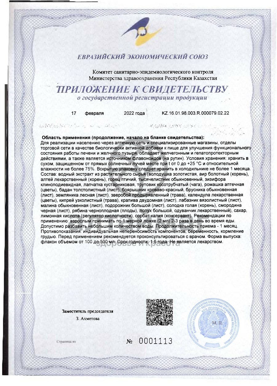 Травы, входящие в состав, препятствуют сгущению желчи, обладают гепатопротекторным действием, способствуют выведению токсинов.